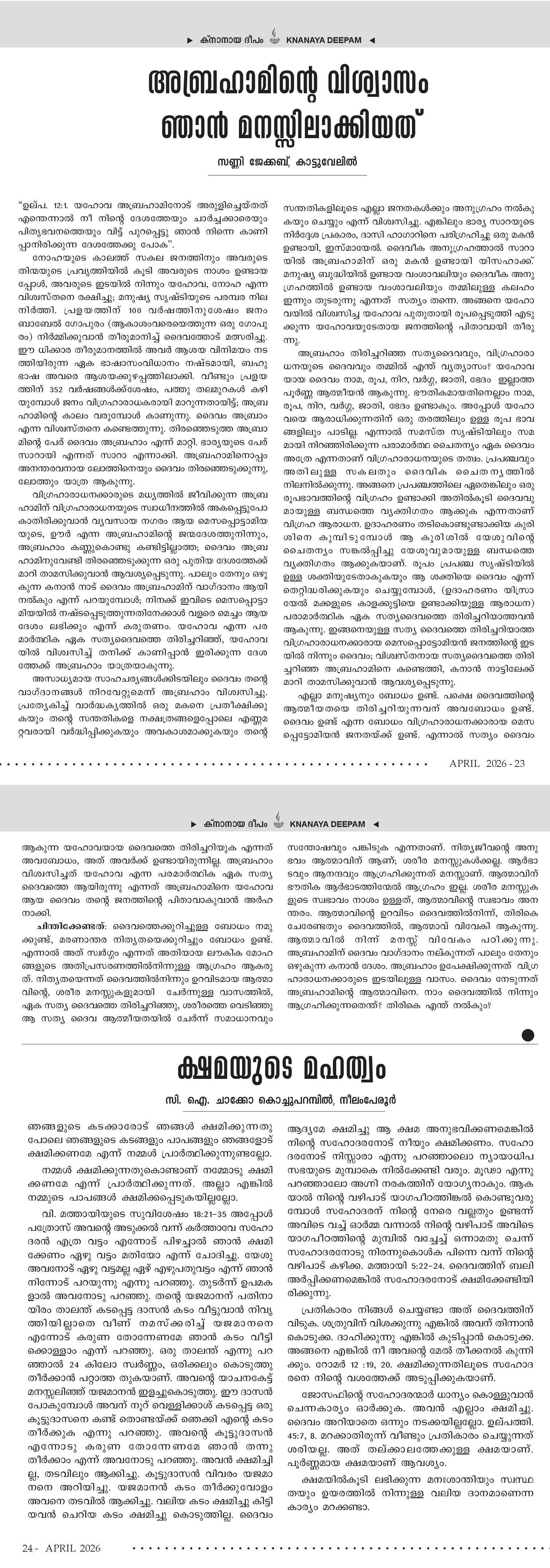 കര്ത്താവില് പ്രിയരെ, ക്രിസ്ത്യാനികള് അത്യുന്നതനായ ദൈവത്തിലും അതുല Editorial Message